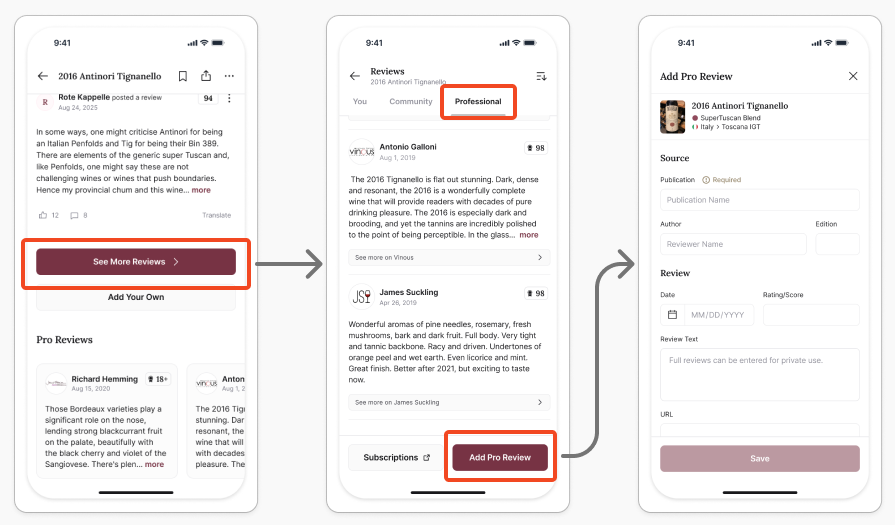 CellarTracker features automatic integration with over 20 professional content channels, plus the ability to manually add your own professional reviews from other sources.