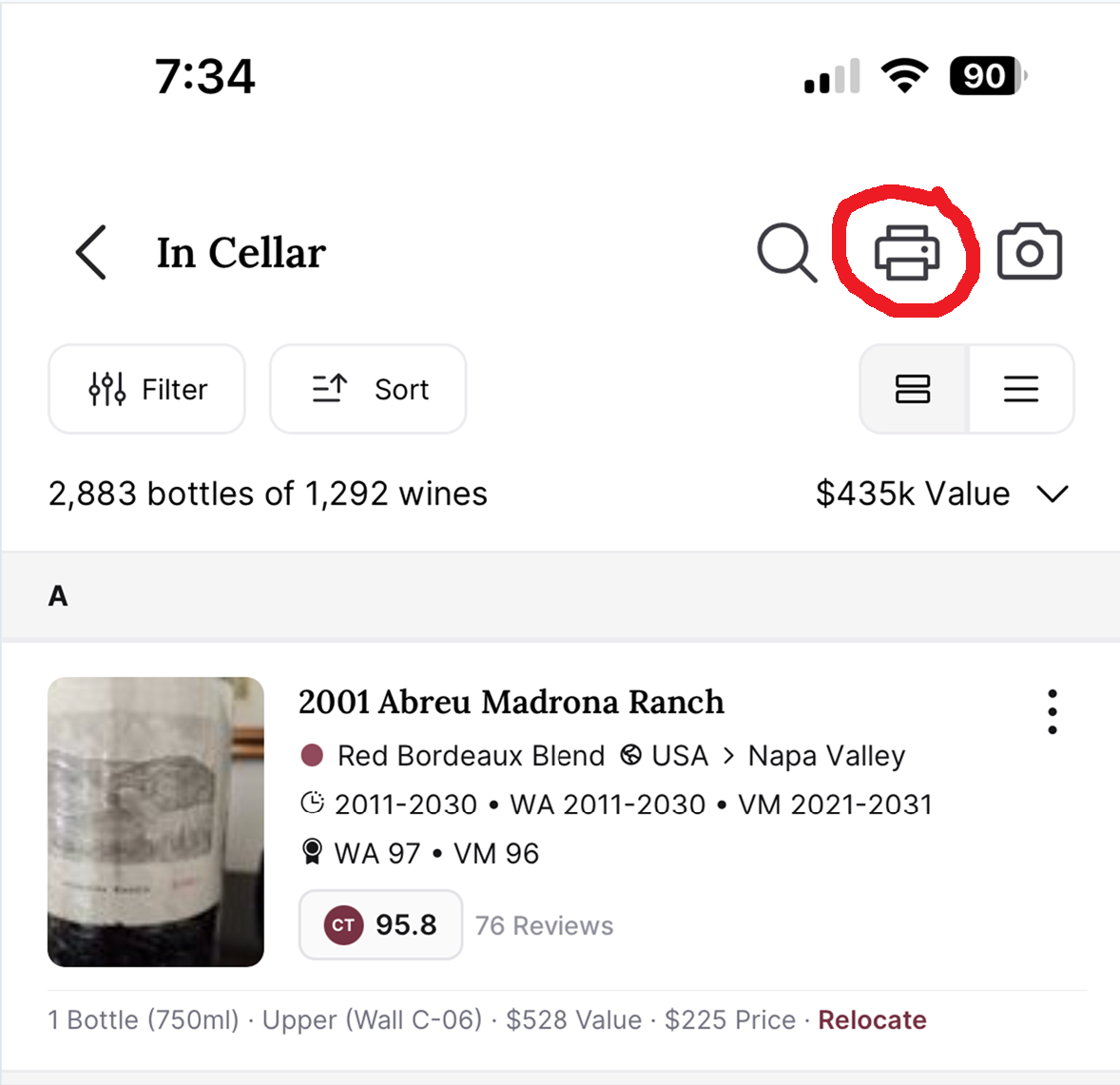 - From the Home Screen, tap on the Collection button at the bottom, then the In Cellar collection, and look for the printer icon at the upper right.