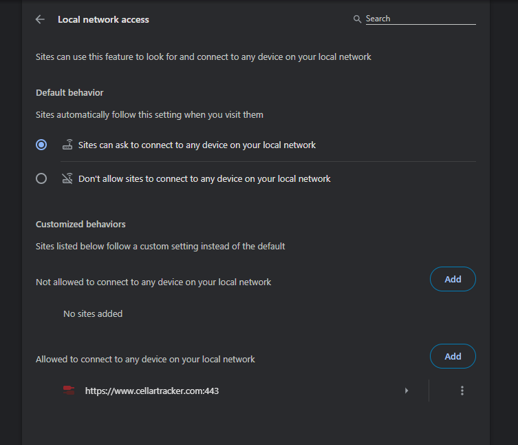 - CHROME users: there was a Chrome update in November, 2025 that automatically blocks local web connections. To allow CellarTracker to connect to Dymo based on this new default Chrome setting for Local Network Access Checks, go to chrome://settings/content/localNetworkAccess and then move CellarTracker to the allowed list (see below screenshot).